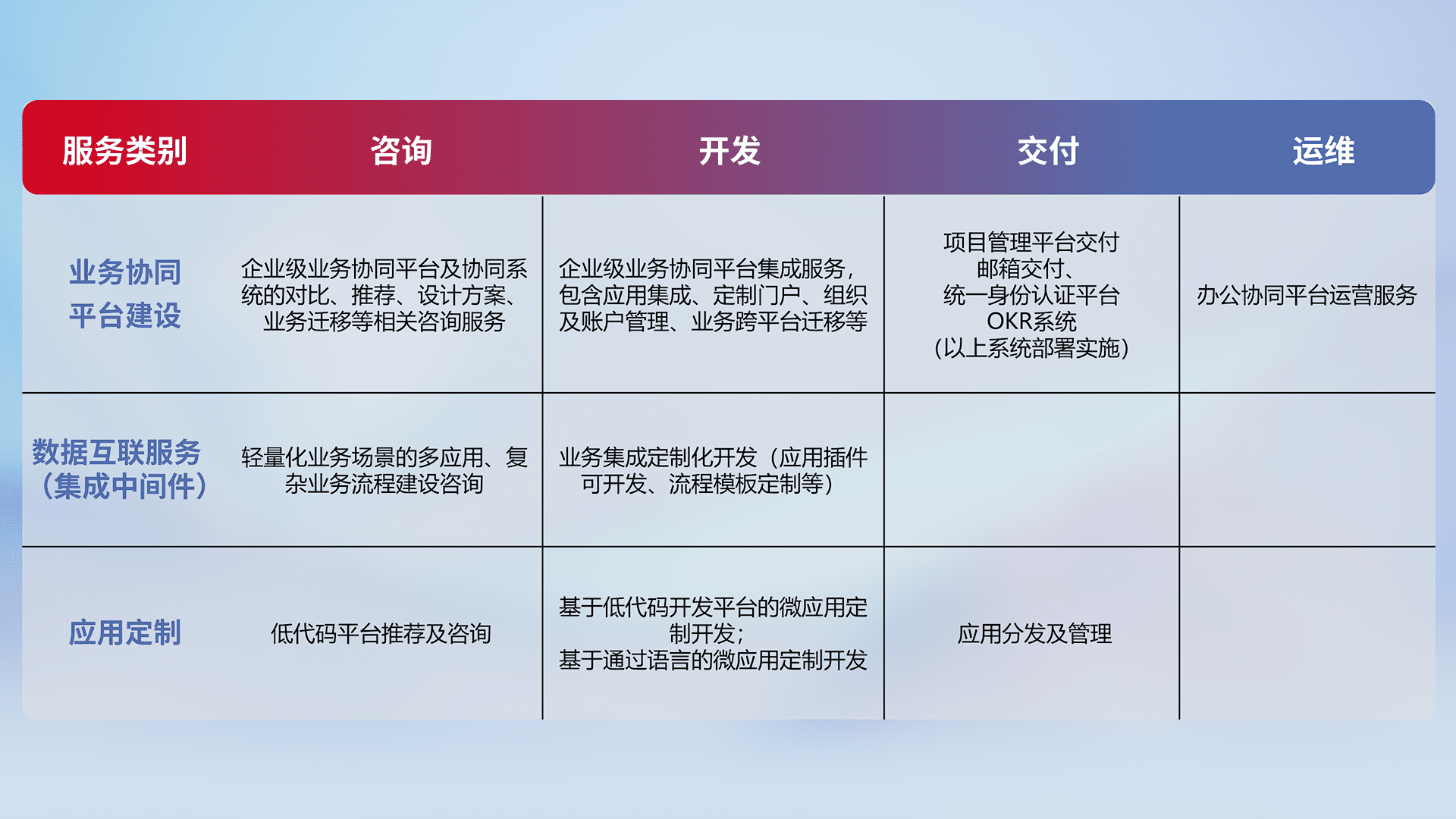 针对钉钉、、、企微、、IDaas等平台级产品提供产品的规划、、、方案、、、交付、、、、定制化开发等服务,,,实现如统一协同办公、、、、智能客户服务、、混合会议管理、、、、智能数据查询、、、等业务场景,,,,实现数字化转型。。。