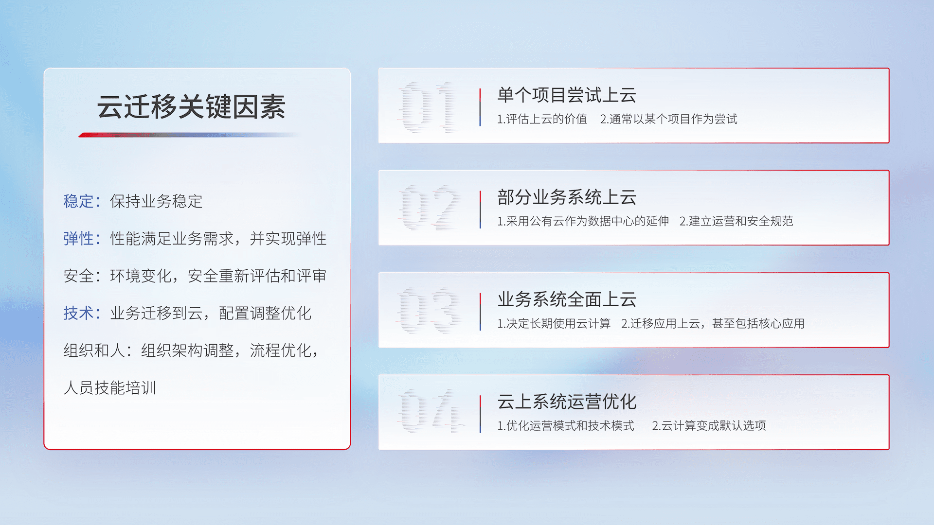 结合实际业务,,,从规划设计、、云平台选型、、、、云原生改造、、、、数据迁移、、集成交付,,,,迁移全过程为客户识别最佳上云路径,,,做好风险识别管理,,,设计网络架构、、身份权限、、、、安全审计合规、、、操作审计、、、、日志审计、、、监控告警策略、、、、多站点容灾设计等,,,,对云上基础设施进行整体规划,,,,提升IT治理水平,,以满足弹性、、高可用、、、高性能的需求。。