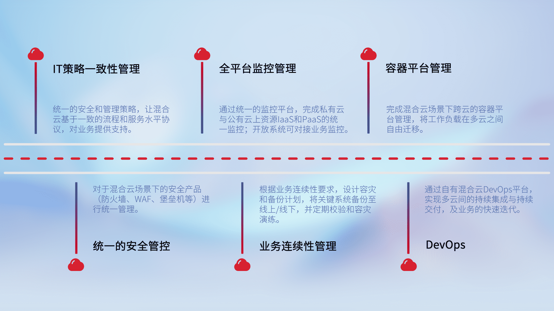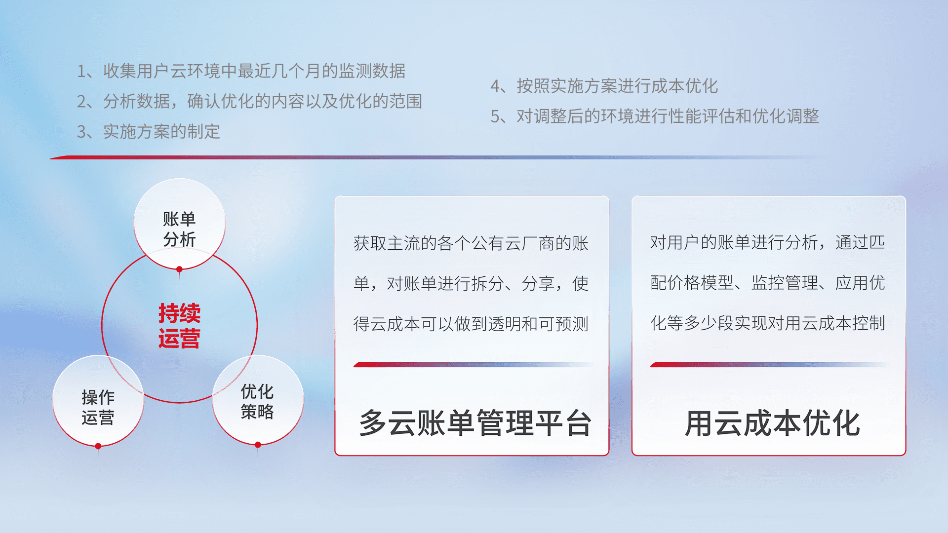 通过多云纳管,,,,以统一的资源数据模型把客户的云资源进行抽象和封装,,进而实现对多云资源的统一操作,,保障云资源管理的可靠性、、稳定性与可用性。。。量身定制化运维内容,,配置、、、、开发运维、、、、补丁管理、、、、备份、、监控、、、认证和访问管理、、审计和日常巡检等,,,保障在用云过程中的可靠度,,稳定度以及高可用率。。